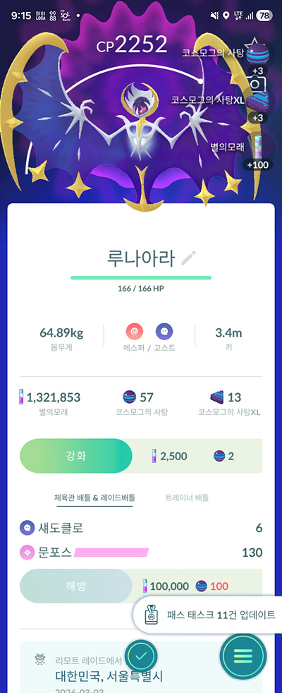 포켓몬고 레이드배틀 루나아라를 포획했습니다.